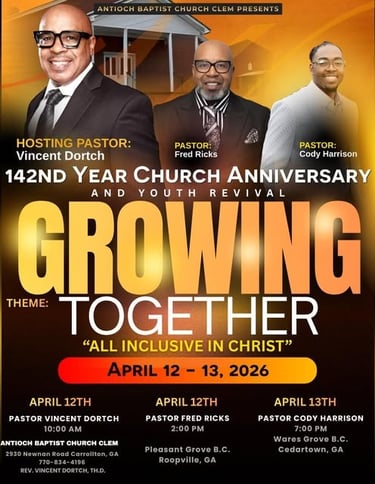 In 1998, Pastor Dortch obeyed God’s Command and announced his Calling into the ministry under the leadership of Pastor Jasper Williams, Salem Bible Church. Subsequently, he was appointed an Elder by Pastor Williams. On September 17, 2000, God chose him to be His under shepherd of Antioch Missionary Baptist Church in Carrollton, Georgia.
